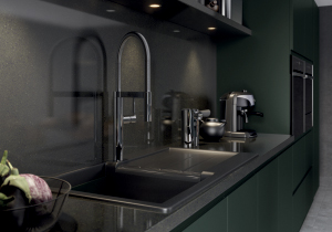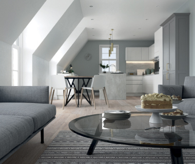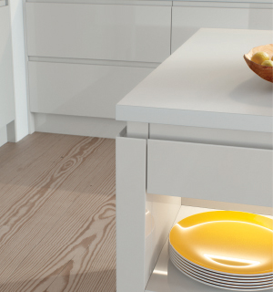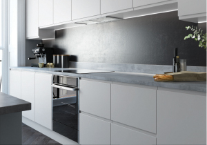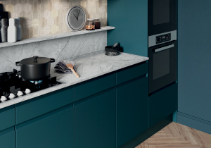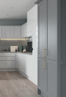 Custom designed to fit an unusual space, this U-shaped kitchen brings together a fusion of styles, colours and finishes. A fine example of apartment style living. The calming colour scheme based on Solaris’ Gloss White door is enlivened by a splash of texture and colour with the inclusion of the Aspen-larder in Dust Grey.